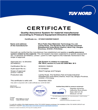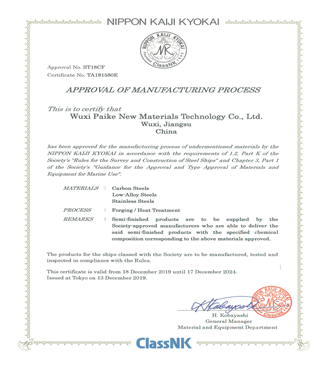 The company has 50 invention patents, has obtained special equipment manufacturing qualification license (pressure pipe components), passed aviation quality management system certification, ISO9001 quality system certification, ISO14001 environmental management system certification, OHSAS18001 occupational health and safety management system certification, The world's nine major classification societies certification, EU TUV certification, heat treatment NADCAP certification.